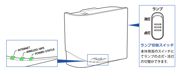 本商品の親機(WN-DX1300GRN)のステータスランプは、点灯、点滅によって状態確認ができます。また、光が眩しい等の理由で点灯させたくない場合は、本体側面にあるスイッチで消灯/点灯の切替が可能です。