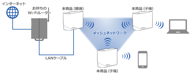 お持ちのWi-Fiルーターに本商品(メッシュセット)をLANケーブルで接続するだけでメッシュネットワークが構築され、Wi-Fiエリアを拡大できます。