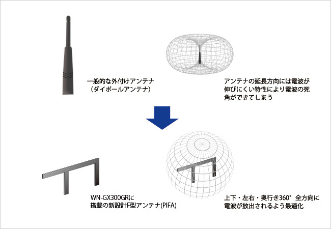 WN-GX300GRには上下・左右・奥行き360°全方向に電波が放出されるよう最適化されたアンテナを搭載し、さらに最大通信距離を極限まで高める高性能パワーアンプを併用した当社独自の「360コネクト」技術を搭載しています。