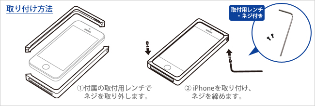 本商品に付属の取付用レンチでバンパーのネジを取り外し、iPhone 5cをセットした後、外したネジを再度取り付ければ装着完了です。