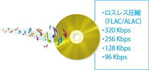 CDレコは、CD音質(ロスレス圧縮:AppleロスレスまたはFLAC形式)で取り込めます。たくさん曲を入れたいときや、スマートフォンの容量を節約したいときは、高音質(256kbps)、標準(128kbps)や長時間(96kbps)も選択できます。