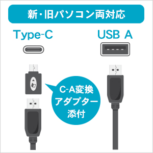 ※ USB Type-Cで使うときは、添付のC(オス)-A(メス)変換アダプターをご利用ください。