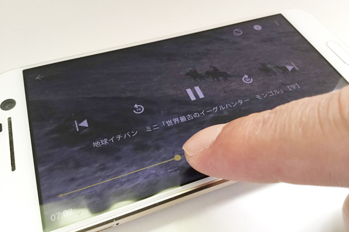 (写真)再生中の画面をタップするとシークバーやスキップボタンが表示される