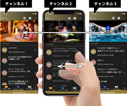 例えば「地デジ」を選択すると、放送中のテレビ番組がすぐに始まります。画面下には、次に放送される番組がリスト表示され、チャンネル切り替えも画面を横フリックするだけで可能です。「REC-ON App」では外出先でのリアルタイムのテレビ視聴も無料なので、ちょっとお得ですね。