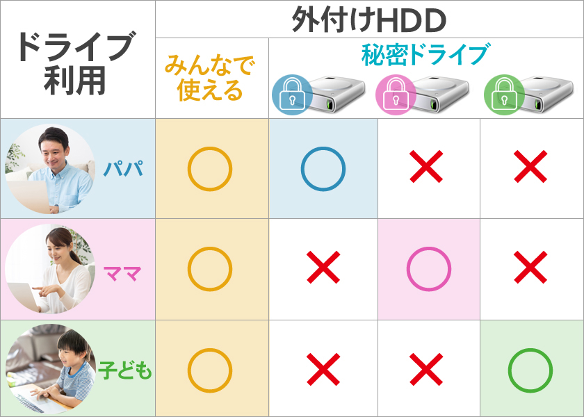 家族や社員同士で共有しているようなHDDの場合、自分以外には見られたくないデータは誰もがあると思います。そんなデータは自分だけしか見られない秘密ドライブへ入れておけば、利用者自身が設定したパスワードを入力しないと開けられないので、プライバシーが守られます。