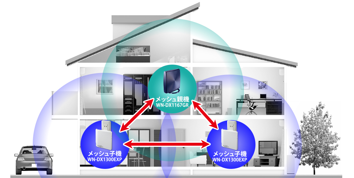 「WN-DX1167GR」は1台をメッシュ親機、もう1台をメッシュ子機として使用