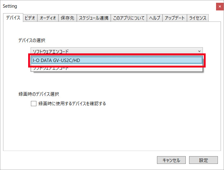 (キャプチャー)「MtgRec」のデバイス設定画面で「GV-US2C/HD」を選択