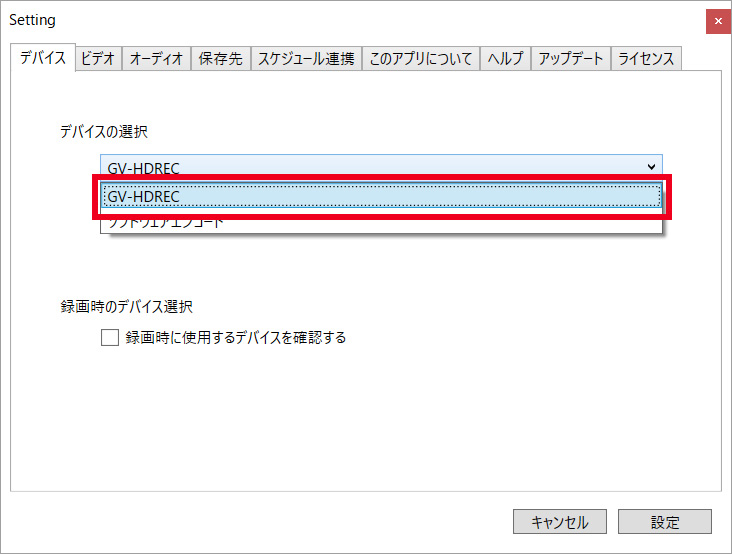 (キャプチャー)「MtgRec」のデバイス設定画面で「GV-HDREC」を選択
