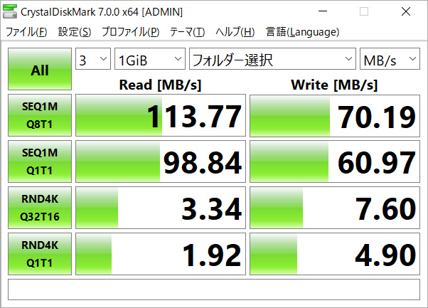 ベンチマークソフト「CrystalDiskMark Ver7.00」を用いて以下の設定にて行った測定値。