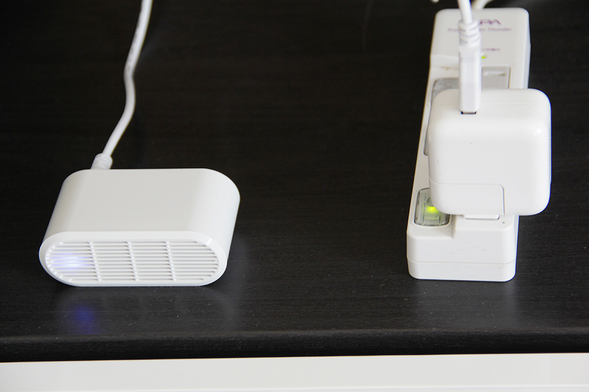 パソコンを設置する場所がない場合、USB充電器(別売)で給電すれば、センサーを単体で使用することもできます。LEDの色でのモニタリングとなりますが、省スペースとなります。