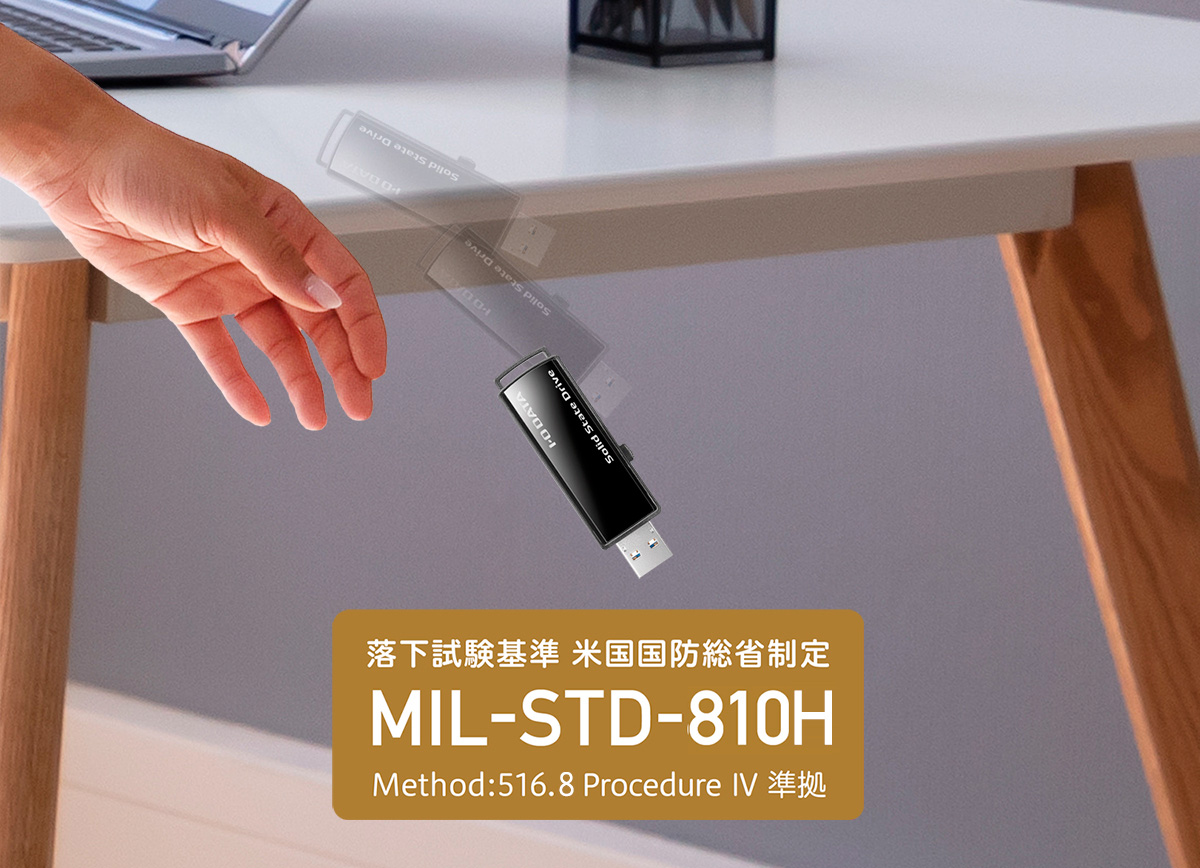 コンパクトな反面、PCデスクの上やポケットから万が一落下させてしまうことが心配になりますが、ご安心ください。「SSPC-USシリーズ」は、MIL-STD-810Hに準拠した落下試験をクリアする耐衝撃性能を備えています。