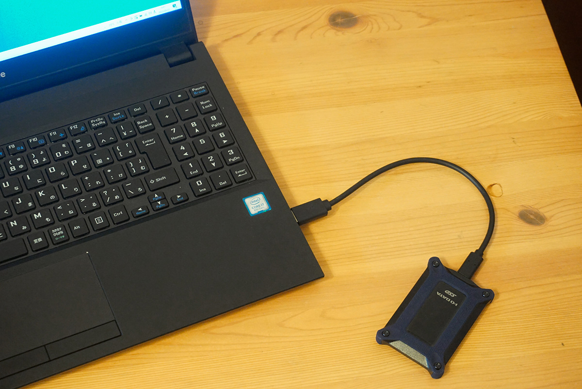 (写真)従来のポータブルSSDは接続にケーブルが必要となる