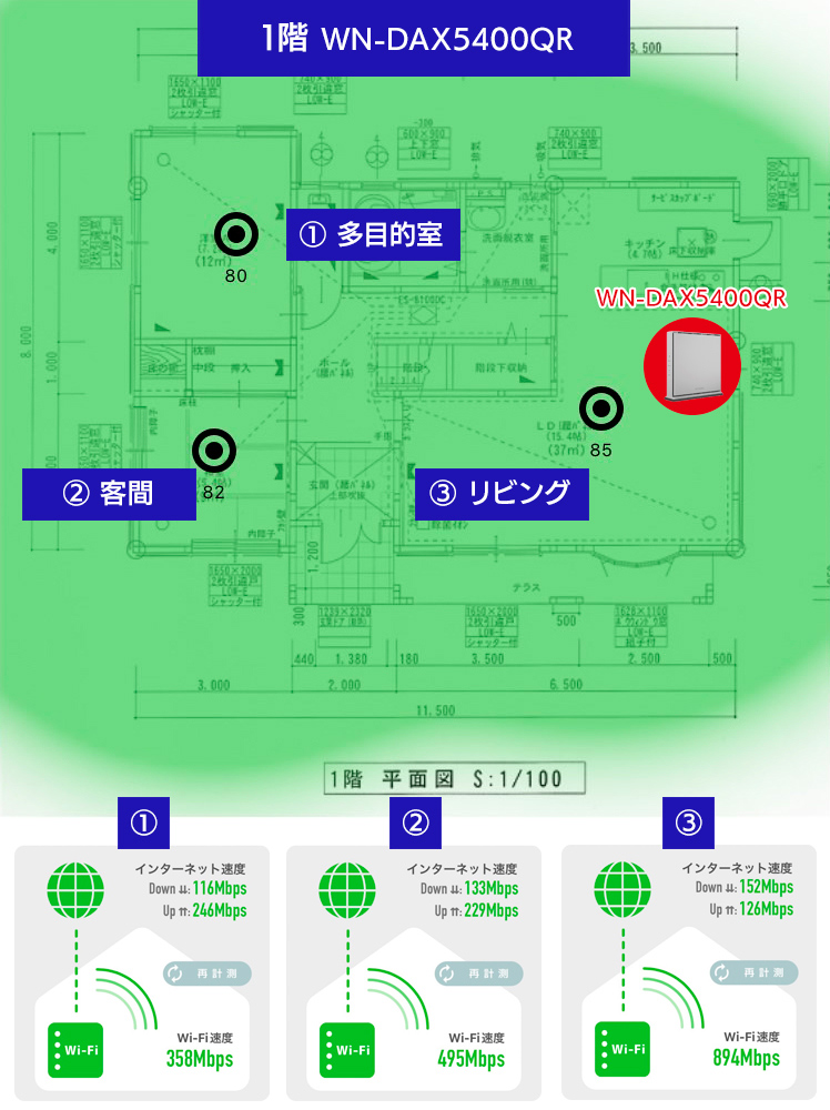 3モデルのいずれも「360(さんろくまる)コネクト」技術を搭載しているので、360°電波が放射され、あらゆる方向に安定してすみずみまで電波が届きます。1階はもちろん、2階もある程度の電波強度を確保できています。