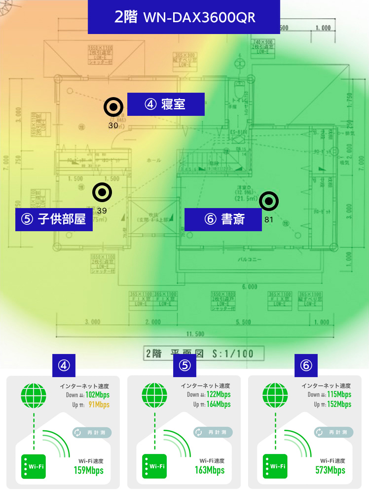ヒートマップを見ると、いずれのWi-Fiルーターも1階は全体に緑色で、電波強度が良好なことが分かります。2階はWi-Fiルーターからの距離が離れた子供部屋や寝室が黄色で、若干電波が弱くなっていることが分かります。
