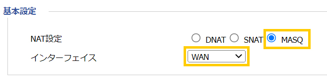 [NAT設定]で[MASQ]を選び、[インターフェイス]で[WAN]を選びます。
