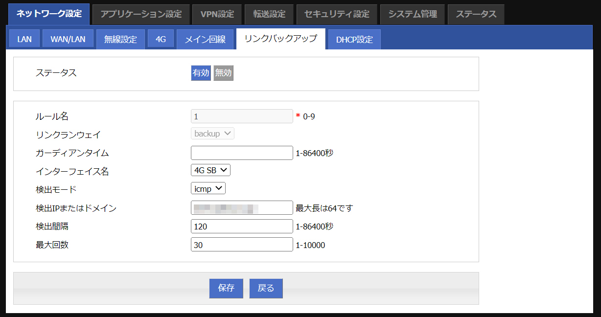 最大回数:30(成功するまで連続でリンクテストを試行する回数。すべてに失敗で回線を切り換え)