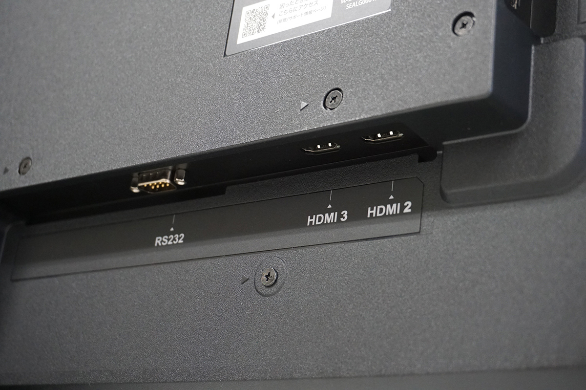 HDMI(4K/60Hz、HDCP2.2)端子が側面に1端子、下部に2端子の合計3端子搭載されています。アナログRGB端子も搭載されているので、パソコンやレコーダーなど豊富な機器と接続できます。また、HDMIケーブルが添付されているので、購入してすぐに機器とつないで使えます。