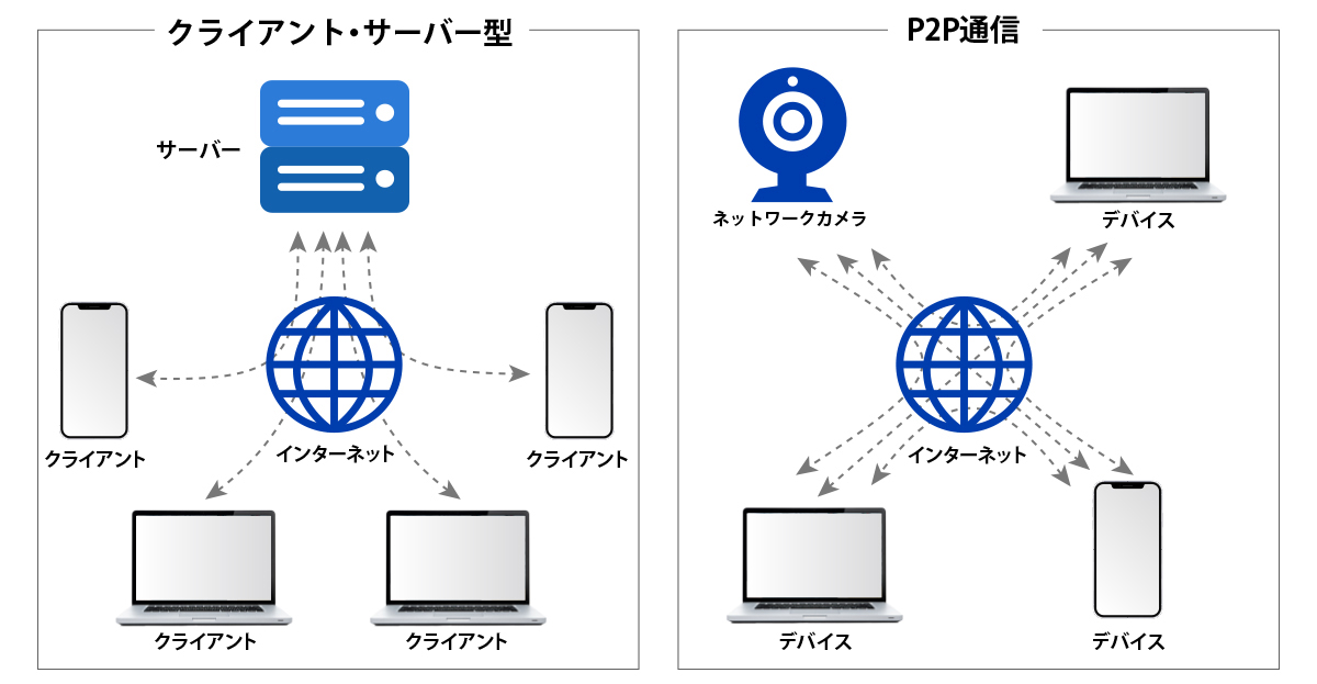 一方、P2P通信は、ネットワークカメラとスマホやパソコン同士が直接通信する方式です。P2P通信は、LINEや仮想通貨のブロックチェーンと呼ばれる仕組みにも利用されています。