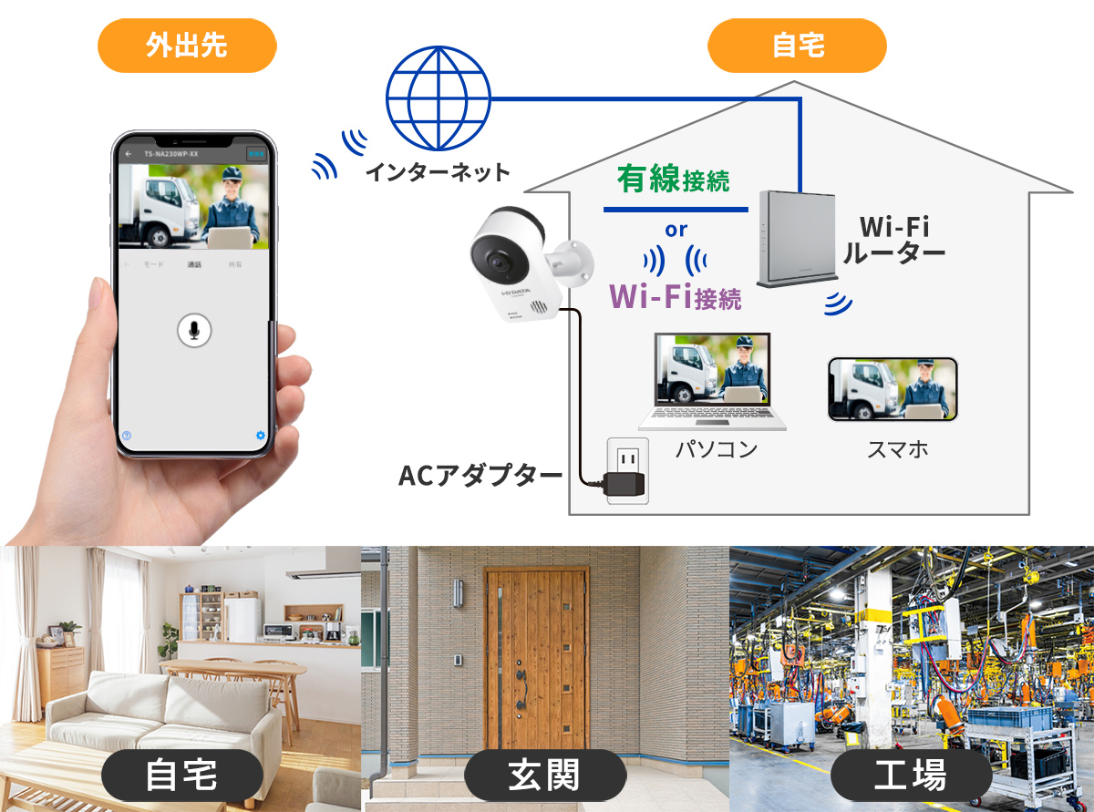 ネットワークカメラは、有線LANやWi-Fi(無線)を使って家庭内LANに接続して利用します。ネットワークにつながることで、家の中はもちろん、外出先など離れた場所からでもカメラ映像が確認できます。