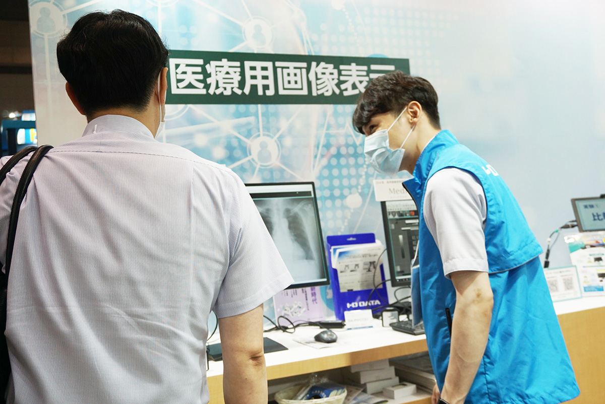 アイ・オー・データ機器のブースでは、サイバーセキュリティ対策のためのバックアップソリューション、医用画像参照用ディスプレイを始め、オンライン資格確認端末など、医療現場のICT化をサポートする商品を展示しました。
