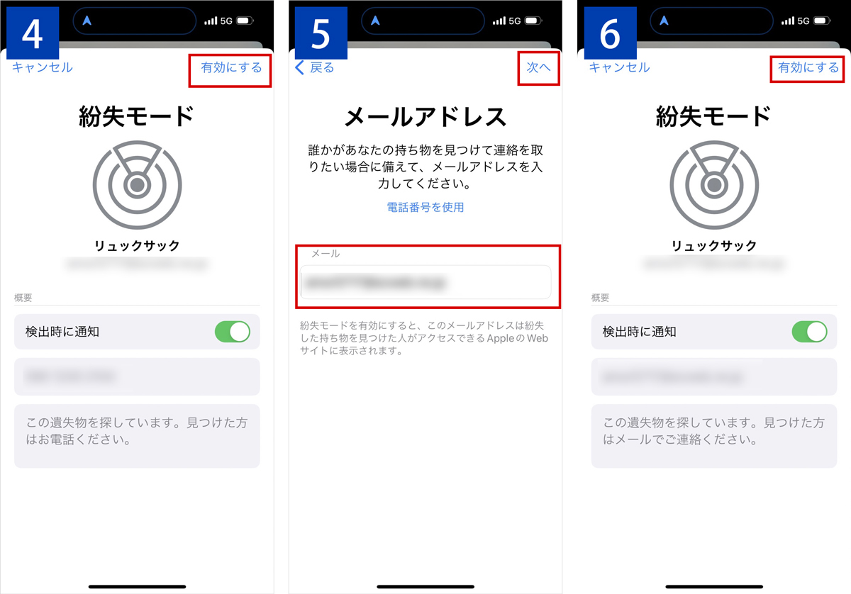 ココタグを付けた持ち物を紛失して、他の人があなたのココタグを見つけると、見つけた人に連絡先(電話番号、または、メールアドレス)を伝えることができる「紛失モード」を設定できます。