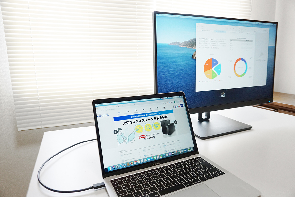 従来のHDMI接続でもマルチモニターにすることは可能ですが、USB Power Delivery対応機器に電源供給、充電ができるUSB Type-Cポートを搭載しているので、ケーブル1本でノートパソコンを充電しながら、映像や音声をモニターに出力できます。