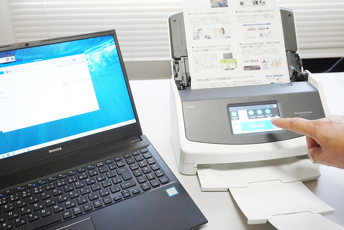 正常にスキャンできるかテストしてみます。ScanSnapのタッチパネルの[Scan]ボタンをタッチします。読み取りのスピードはとても速いです。