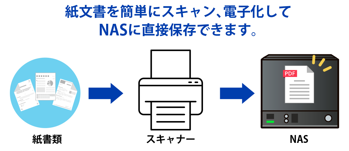 この問題をスグに解決できるのが、スキャナー「ScanSnap iX1600」とNAS「HDL2-XABシリーズ」です。スキャナーとNASを連携する設定さえしてしまえば、PCを使わなくても、スキャナーのタッチパネル操作だけで簡単にNASへ保存できるようになります。