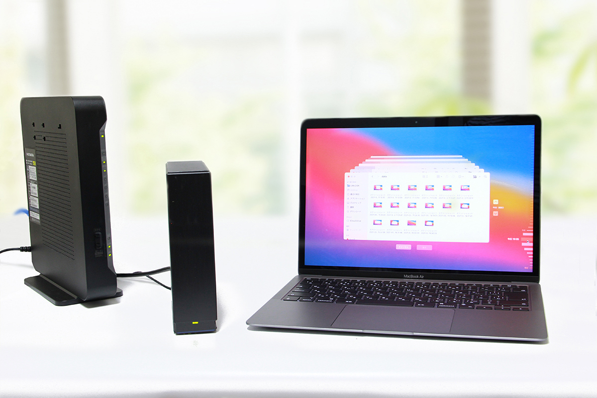 Time Machine機能はUSB接続したHDDやSSD以外でも、Wi-Fiネットワークに接続されたNASをワイヤレスで利用することもできます。Mac本体にストレージを直接接続する必要がなく、一番スッキリとします。バックアップするタイミングのたびにストレージ機器をMac本体に接続する煩わしさも無くなります。
