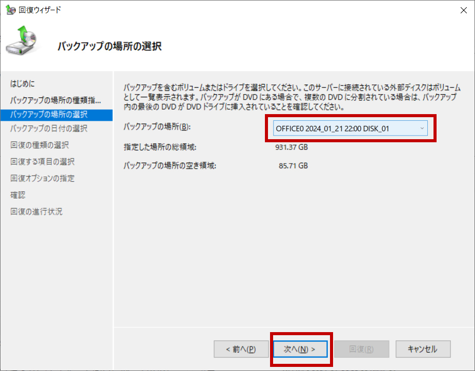 [バックアップの日付の選択]画面で、回復に使うバックアップデータの日付と時刻を選び、[次へ]をクリックします。