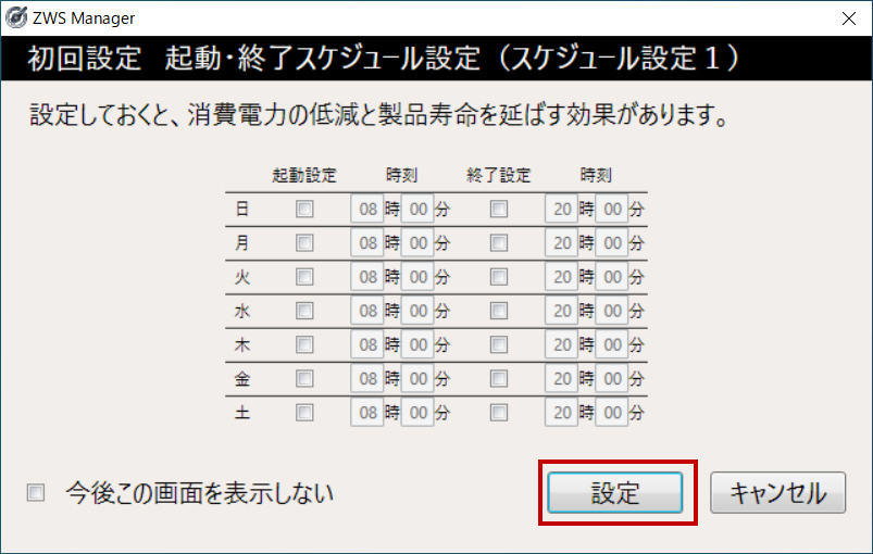 続いて、起動・終了スケジュールの設定画面になるので、希望の設定に変更して[設定]をクリックします。