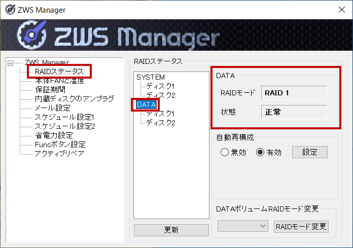[RAIDステータス]をクリック、[DATA]をクリックします。現在の設定モードと状態が表示されます。画面の場合、出荷時設定の[RAID 1]で正常に動作していることが確認できます。