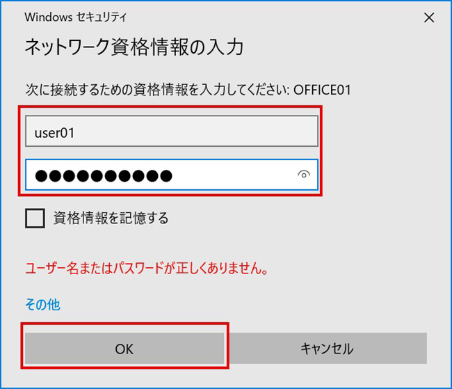 資格情報の入力画面が表示されるので次の資格情報を入力して[OK]をクリックします。