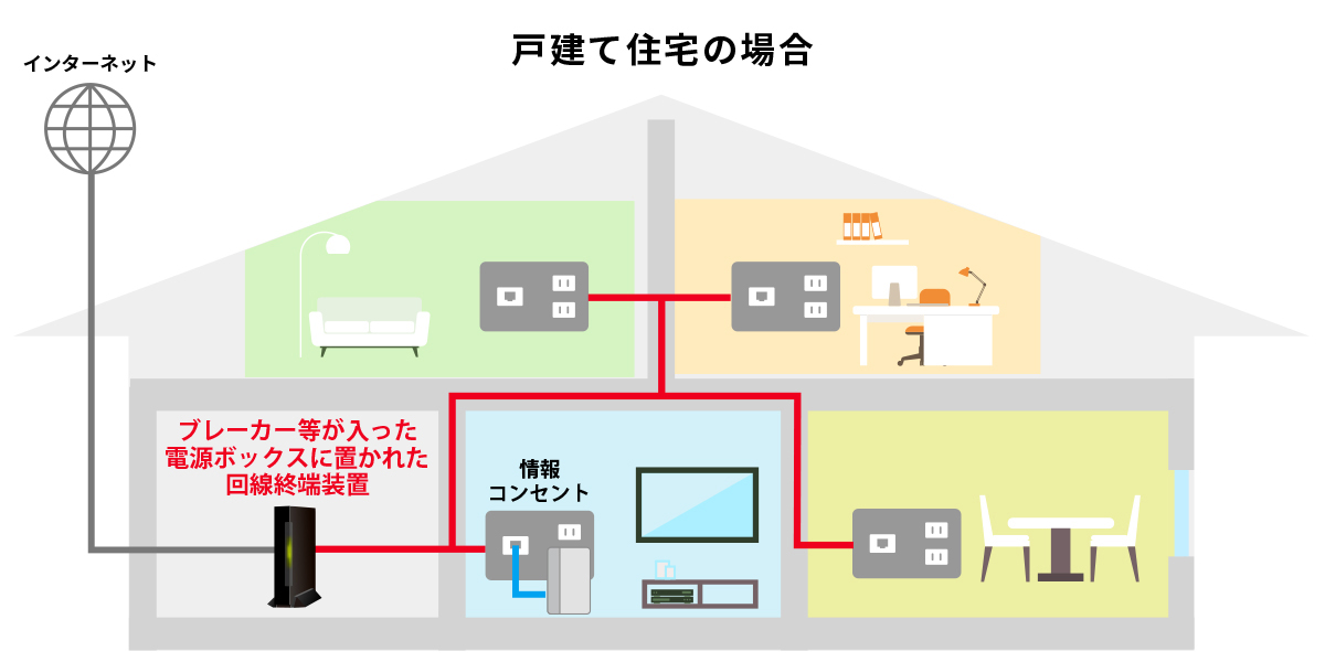 一方、情報コンセントの場合は、集合住宅ならば、共用部にインターネットと接続する大元の回線終端装置が設置され、そこから各世帯に分配されている事が多く、戸建て住宅ならばブレーカー等が入った電源ボックスにインターネットと接続する大元の回線終端装置が設置され、そこから各部屋に分配されている事が多いです。各世帯、各部屋に設置された端子と接続するだけで使用できます。