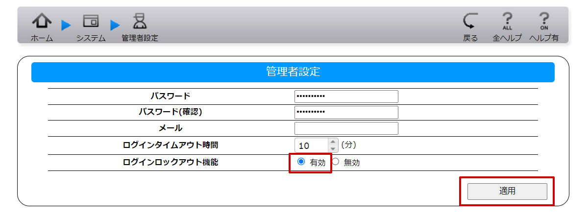 「ログインロックアウト機能」の[有効]をチェックして、[適用]をクリックします。設定はこれだけです。