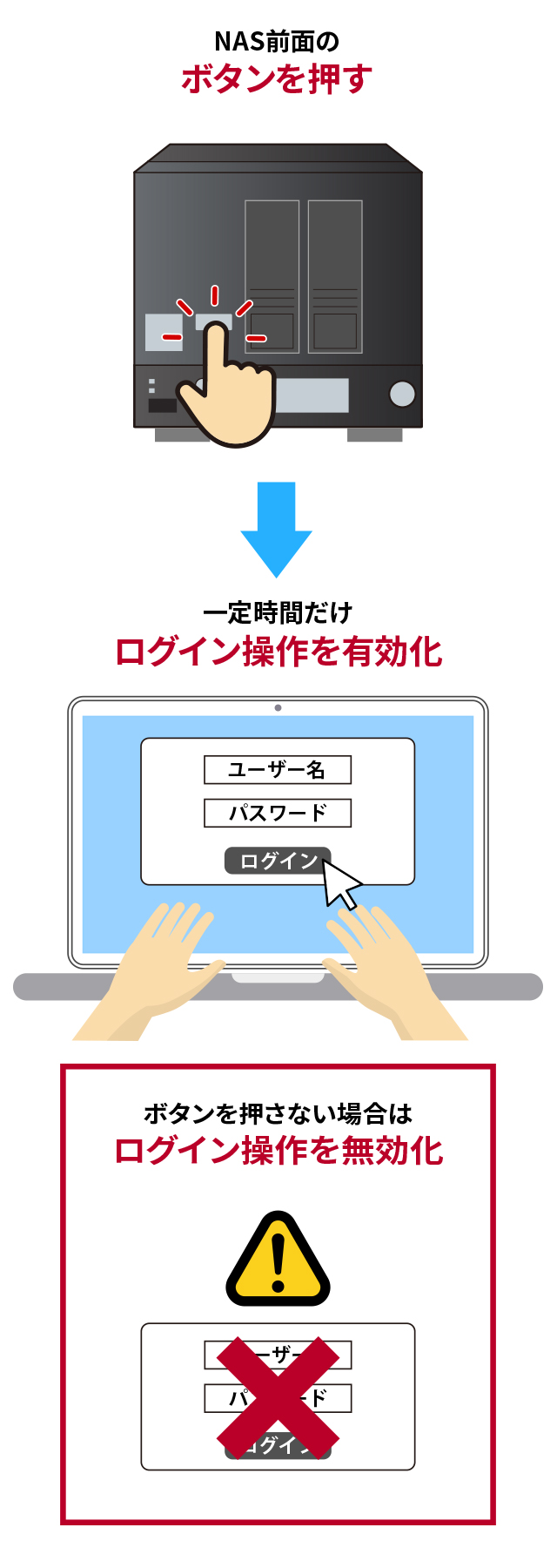 NASの管理画面へのログイン操作を行う前に、NAS本体の前面にあるボタンを押さないかぎりログインを無効にする、I-O DATA独自のセキュリティ機能です。パソコンでのログイン操作に加え、「ボタンを押す」というアナログ的要素を組み合わせた他社にはない(2025年2月現在)ユニークな機能です。