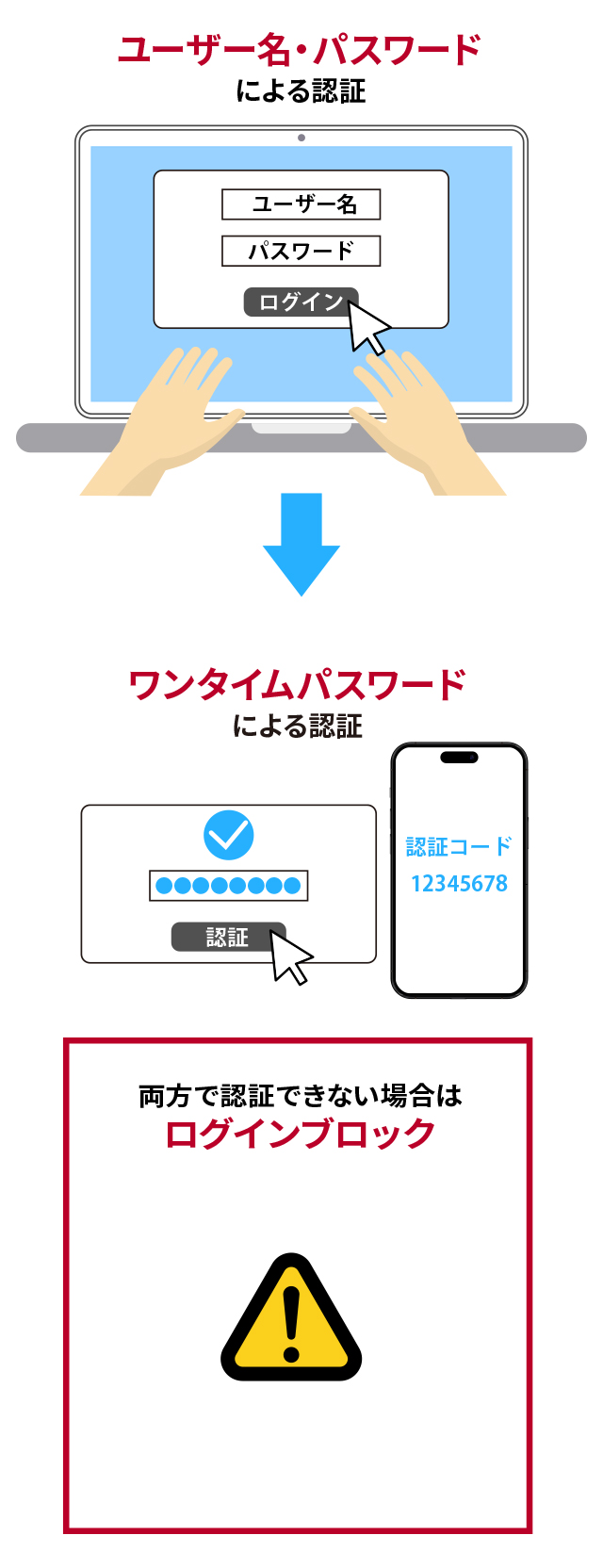「多要素認証」を設定することで、管理画面へのログイン時に、スマホやパソコンの認証アプリケーションで発行される認証コードの入力を必須にする機能です。通常のユーザー名とパスワードに加えてワンタイムの認証コードが必要となるため、なりすましなどの不正アクセスを防ぎます。