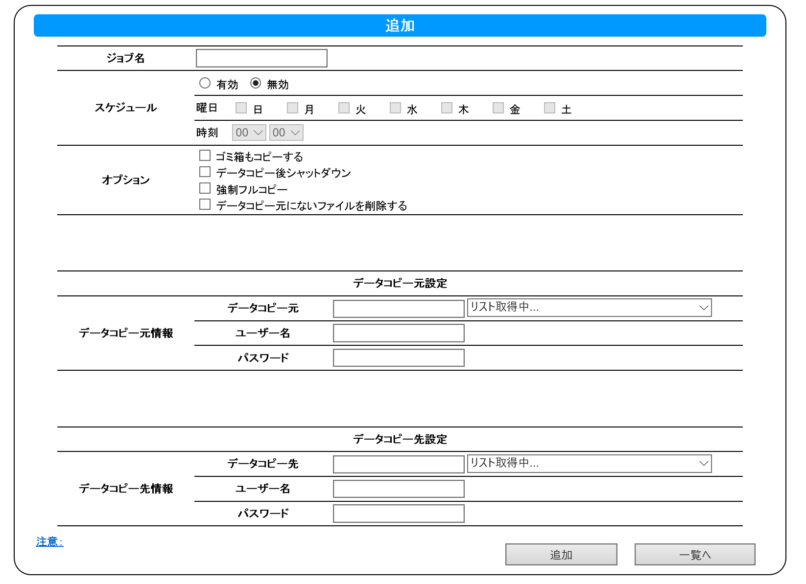 ①「データバックアップ」→②「データコピー」→③「追加」を選択すると設定項目が表示されます。
