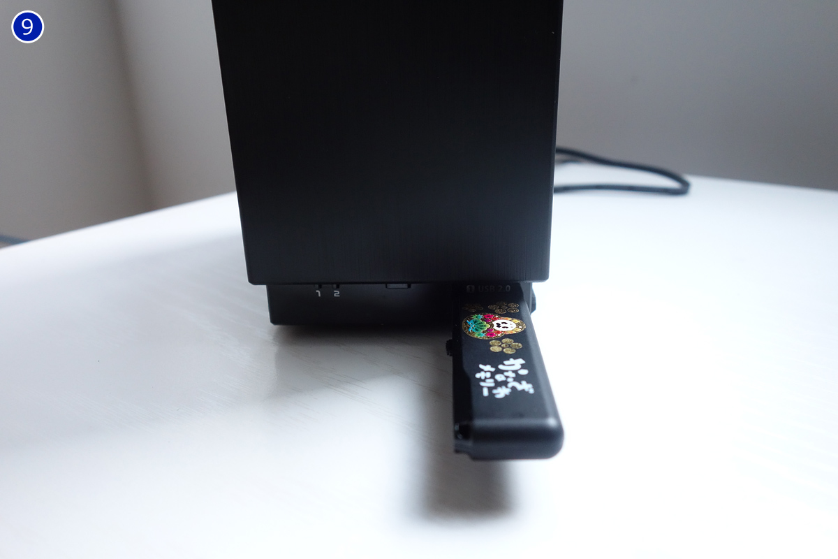 ⑦USBポート1(正面)にUSBメモリーを差し込み、本商品の電源ボタンを押します。