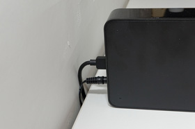 その背面部分は大きくえぐられている。接続したケーブルは背面下部に設けられた切り欠きのようなところから出てくるので、HDDの背面をぴったり壁などにくっつけてもケーブルを挟むことはない。今までにもありそうでなかったちょっとした工夫なのだが、効果は抜群だ。これなら、ごっちゃごちゃな狭っ苦しい場所でも、美しく置けるはず!