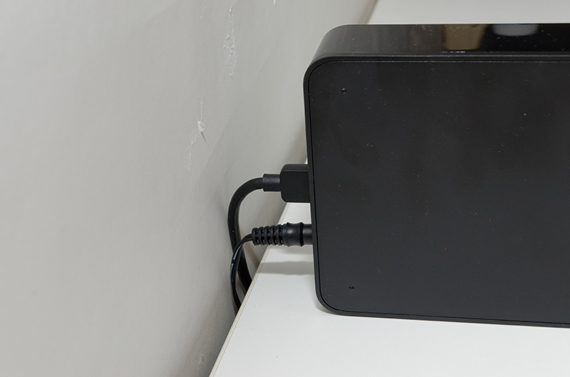 そして、最大のポイントと言えるのが、背面に設けられた端子の配置の工夫。一般的な製品だと、USBケーブルと電源ケーブルは背面にまっすぐ差し込むことになるため、ケーブル末端のコネクター部分の長さ+αの分だけ背後の壁などからHDD本体を離して設置せざるを得なかった。ところが、HDEL-UTでは端子部分が真下に向けて取り付けられているため、接続したUSB・電源ケーブルも真下に向かうことになる。