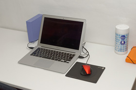 普段よく使っているのはMacBook Airだが、ときどき必要になるWindows 10のデスクトップPCはデスクの下、床に直に置いているので、デスク上に置いたHDEL-UTから真下に伸びるUSBケーブルと電源ケーブルは、ちょうど都合がいい。本来はUSB HDD自体もデスク下に追いやって目立たなくしてしまいたいところだが、HDEL-UTならあえてデスク上に置きたくなってしまう。
