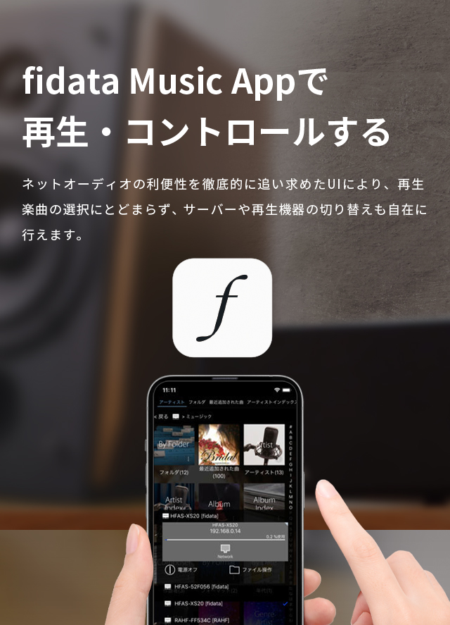当社オリジナル再生・コントロールアプリ「fidata Music App」で、ストリーミング音楽サービスやSoundgenic Plusに保存された楽曲を指定したプレーヤーで再生・コントロールすることができます。
