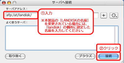 [サーバへ接続]画面が表示されますので [サーバアドレス]で[afp:/at/landisk/]※と入力します。