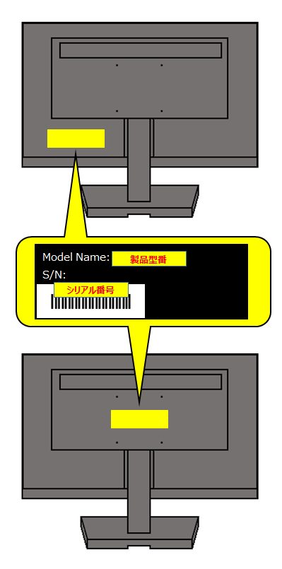 モニターの製品型番やシリアル番号(S/N)は、製品本体のの背面に貼られているシールまたは製品箱で確認することができます。