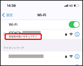 iPhone(iOS端末)をWi-Fiルーターや中継器(リピーターモード)に無線接続した際、暗号化方式の組み合わせにより、iPhone(iOS)側が安全性が低いと判断する場合があります。