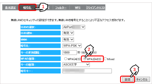 ※最新のWi-Fiルーターは初期値がWPA2やWPA3(AES)になっています。
