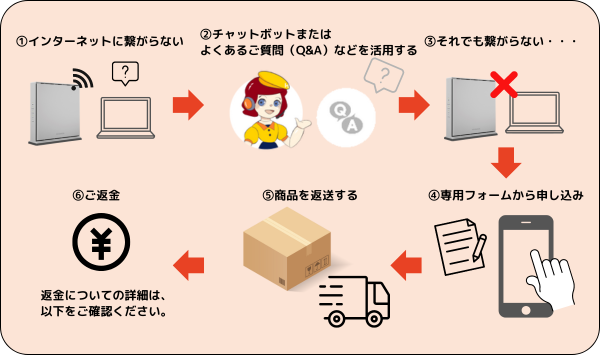 対象製品をご購入後、2週間以内にチャットボットや、よくあるご質問(Q&A)をご確認いただき対処をお試しいただいたにもかかわらず、インターネットに繋がらない場合は、以下の専用フォームよりお申し込みいただくことにより、当社が直接、購入代金をご返金させていただきます。