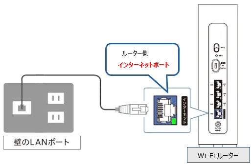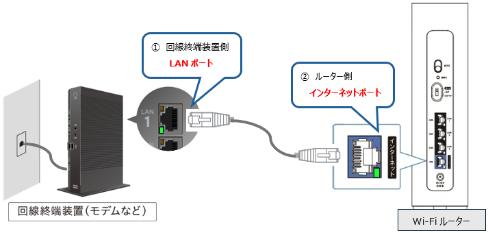 下図を参考に、LANケーブルをつなぐポートが正しいか確認、正しい場合は一度抜き差しし、Wi-Fiルーターの[インターネットポート]のランプが点灯することを確認してください。