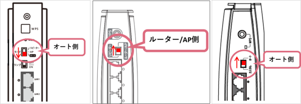 本体のスイッチが[オート]または[ルーター/AP]になっているか確認し、異なる場合はスイッチを切り替えて、ルーターの電源を入れ直してください。(電源入れ直しで再起動しないと切り替えが有効になりません。)数分後インターネットに接続できるか確認してください。接続されない場合は対処3をお試しください。